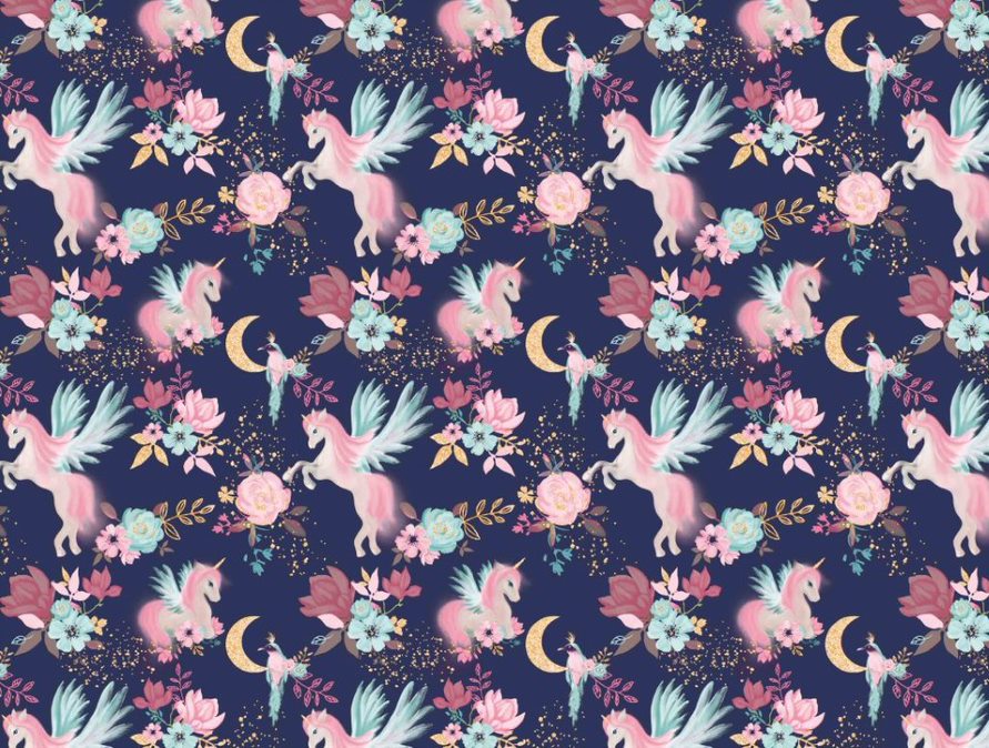 Bawełna różowe jednorożce w kwiatach na granacie 125g/m2 szerokość 1,6m